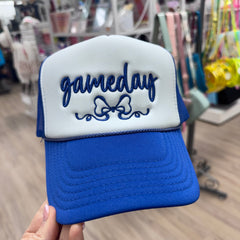 Get ready to represent your favorite school in style with the Blue gameday Puff Foam Trucker Cap! Made with 100% polyester and a structured, firm front panel, this 5 panel cap provides a seamless foam front panel with lining for maximum comfort. It features a slight curved visor, 6 rows stitching on the visor, and a matching fabric undervisor and sweatband. With a plastic adjustable snap, it's one size fits most for adults. Show off your school pride with this unique and playful cap!