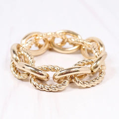 This larger link bracelet features a mix of smooth and textured links and is designed to stretch to fit most wrists. It serves as a stylish statement piece on its own or can be layered in a bracelet stack for added flair.