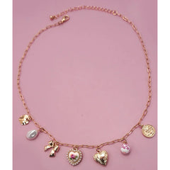 Pink Ceramic Porcelain Bow Heart Locket Multi-Charm Link Chain Necklace, featuring an enchanting mix of charms, including a delicate pink ceramic toile pattern bow, a heart-shaped locket, and other dainty accents, this necklace exudes charm on a fine, delicate link chain.