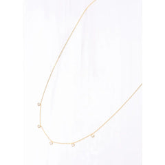 This thin gold necklace features petite round CZs for a dainty look. Wear alone for a simplistic look or layer with other necklaces for a fuller look.