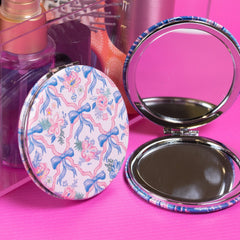 This perfectly sized 3" compact mirror is great for any purse or travel bag. Two mirrors inside; one regular mirror and one magnifying mirror.
