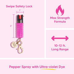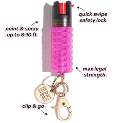 BLINGSTING Pepper Spray is compact, durable, lightweight and maximum self-defense power. With a swipe-safety lock to prevent misfires and a sturdy lobster clip that easily attaches to any keychain, purse, or bag - so cute, it hurts!