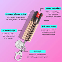 BLINGSTING Pepper Spray is compact, durable, lightweight and maximum self-defense power. With a swipe-safety lock to prevent misfires and a sturdy lobster clip that easily attaches to any keychain, purse, or bag - so cute, it hurts!