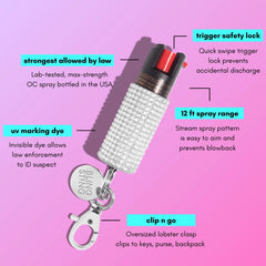 BLINGSTING Pepper Spray is compact, durable, lightweight and maximum self-defense power. With a swipe-safety lock to prevent misfires and a sturdy lobster clip that easily attaches to any keychain, purse, or bag - so cute, it hurts!