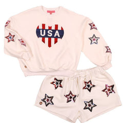 Stand out in our sequin sets featuring fun and bright themes. Features a crewneck pullover and matching shorts with a... View Details -