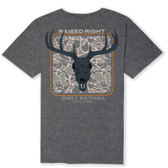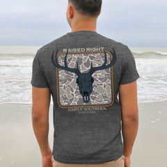 From $24.99Dark grey short sleeve shirt with the phrase 'Raised Right' and a deer skull and horns with a camo backdrop.... View Details -