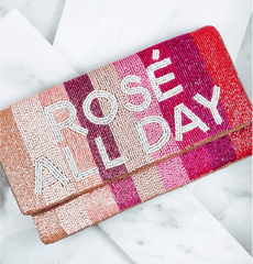 $62.99This beaded crossbody and clutch features the popular phrase "Rosé All Day" spelled out. The background is an eye-catching striped... View Details -
