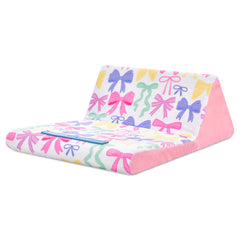 The Pretty Bows Tablet Pillow is the perfect companion for all your devices and reading materials. Its soft fleece material and memory foam filling provide ultimate comfort while the keyboard shelf adds convenience. Use it with your tablet, e-reader, laptop, books, or magazines - open or folded, it's always ready for you.