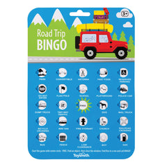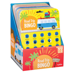 Toysmith’s Road Trip Bingo Game is available in 4 road-trip-inspired illustrations including desert, beach, city and mountains. Cards are either red, yellow, green, or blue with road-trip and environmental drawings. Each card holds 24 unique slots with one free spot in the middle. Slide the windows closed to mark a spot. Assorted boards.