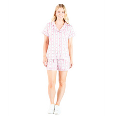 This adorable pajama set features a short sleeve button down top and matching short bottom. Made of 95% polyester and...