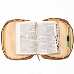 Introducing our new Bible Cover in luxurious vegan leather, where timeless style meets everyday function. Whether you're heading to church or a Bible study group, this cover is designed to protect and organize. The full zippered exterior keeps your Bible secure, while the thoughtfully designed interior features multiple pockets for notes and study guides, plus an elastic pen holder for added convenience. Sleek, practical, and gift-worthy, it's the perfect companion for your faith journey.