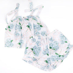 Treat yourself or a loved one to an elegant sleep set with the Hydrangea Ribbons Pink Tie Top Sleep Set. Crafted from woven cotton, it promises comfort & style with a tie top tank & drawstring waist ruffle shorts for a cozy night's sleep. With its eye-catching hydrangea ribbons print, high-quality fabric, & airy silhouette, this sleep set will make it hard not to want to stay in bed all day! Put some luxury into your downtime with the Hydrangea Ribbons Pink Tie Top Sleep Set - you won't regret it!