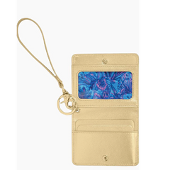Printed Shells N Bells leatherette exterior Snap closure for secure storage Includes 2 card slots, cash pocket, and clear ID window Envelope-style opening with scalloped edge detail Exterior pocket for added convenience Finished with gold hardware and gold Lilly logo Includes a chain wrist strap for hands-free carrying