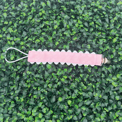This pacifier clip features a sturdy grosgrain ribbon with charming rick rack trim along the sides for an added touch of texture. The simple design includes a secure metal clasp an a loop for attaching pacifiers or small toys. Its smooth surface is ideal for personalizing with a monogram, making it both practical and customizable.