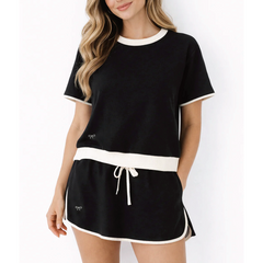 The Activewear Skort set top features contrasting collar, sleeve and hem detailing, a rounded neckline, drop shoulder, and regular fit. The skort features a contrasting elastic waistband with drawcord and binding with interior short. Made of 75% polyester, 20% cotton, and 5% elastane.