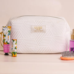 This fully lined cosmo bag is perfect for throwing your makeup, brushes, or hair accessories in for travel. Featuring a textured terry outside with top zipper and Simply Southern logo. Made of 100% polyester