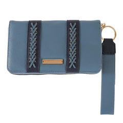 This phone wallet features a front braiding, wrist strap, phone slot, card slots and cash slot. Measures approx 8" x 4.5"