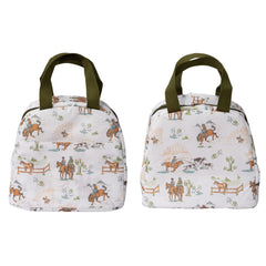 Bring the beauty of nature inside with this Wanna Be A Cowboy Lunch Tote! The lively pattern will make your day, while the water resistant canvas and PEVA lining keep your lunch safe and fresh. With a handy front zipper pocket, you can also pack other goodies with ease. Fancy, functional, and fabulous all around - let your lunch make a statement!